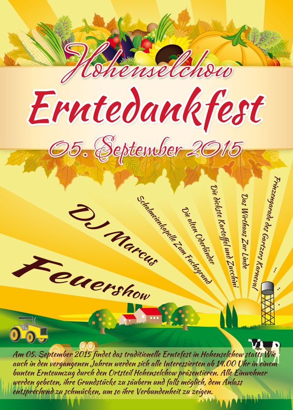 Am 05. September 2015 findet das traditionelle Erntefest in Hohenselchow statt. Wie auch in den vergangenen Jahren werden sich alle Interessierten ab 14.00 Uhr in einem bunten Ernteumzug durch den Ortsteil Hohenselchow präsentieren. Alle Einwohner werden gebeten, ihre Grundstücke zu säubern und falls möglich, dem Anlass entsprechend zu schmücken, um so ihre Verbundenheit zu zeigen.