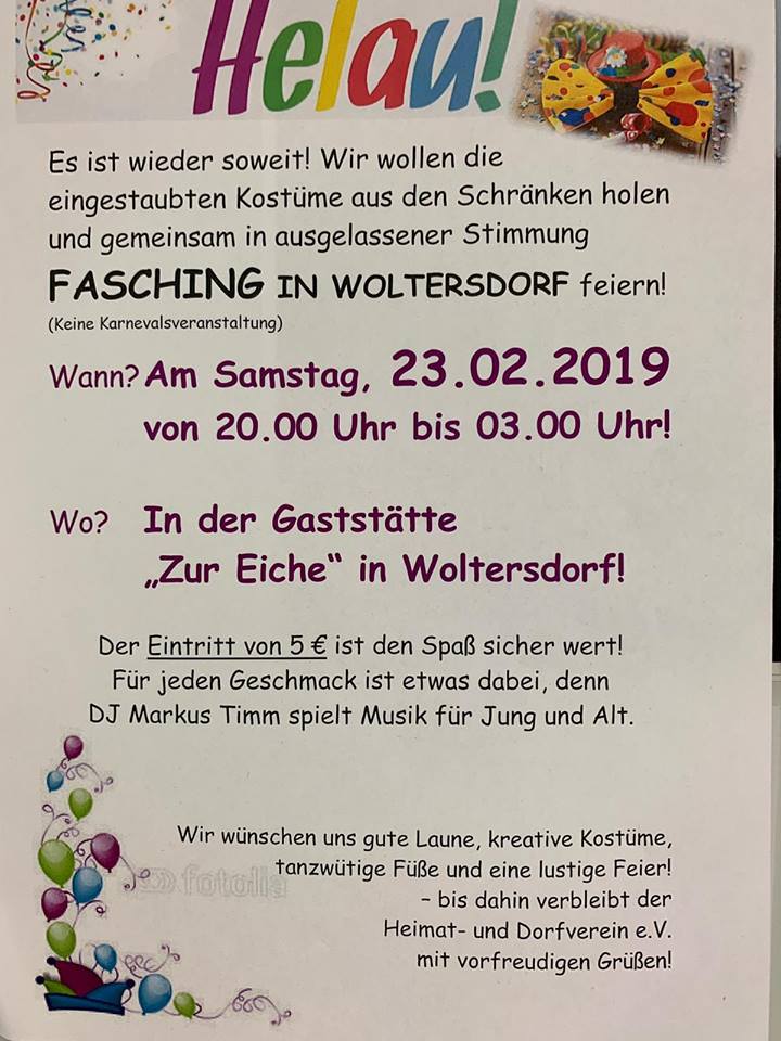 Am Februar 23.Februar 2019 wird in Woltersdorf in der Gaststätte „Zur Eiche“ Fasching gefeiert!