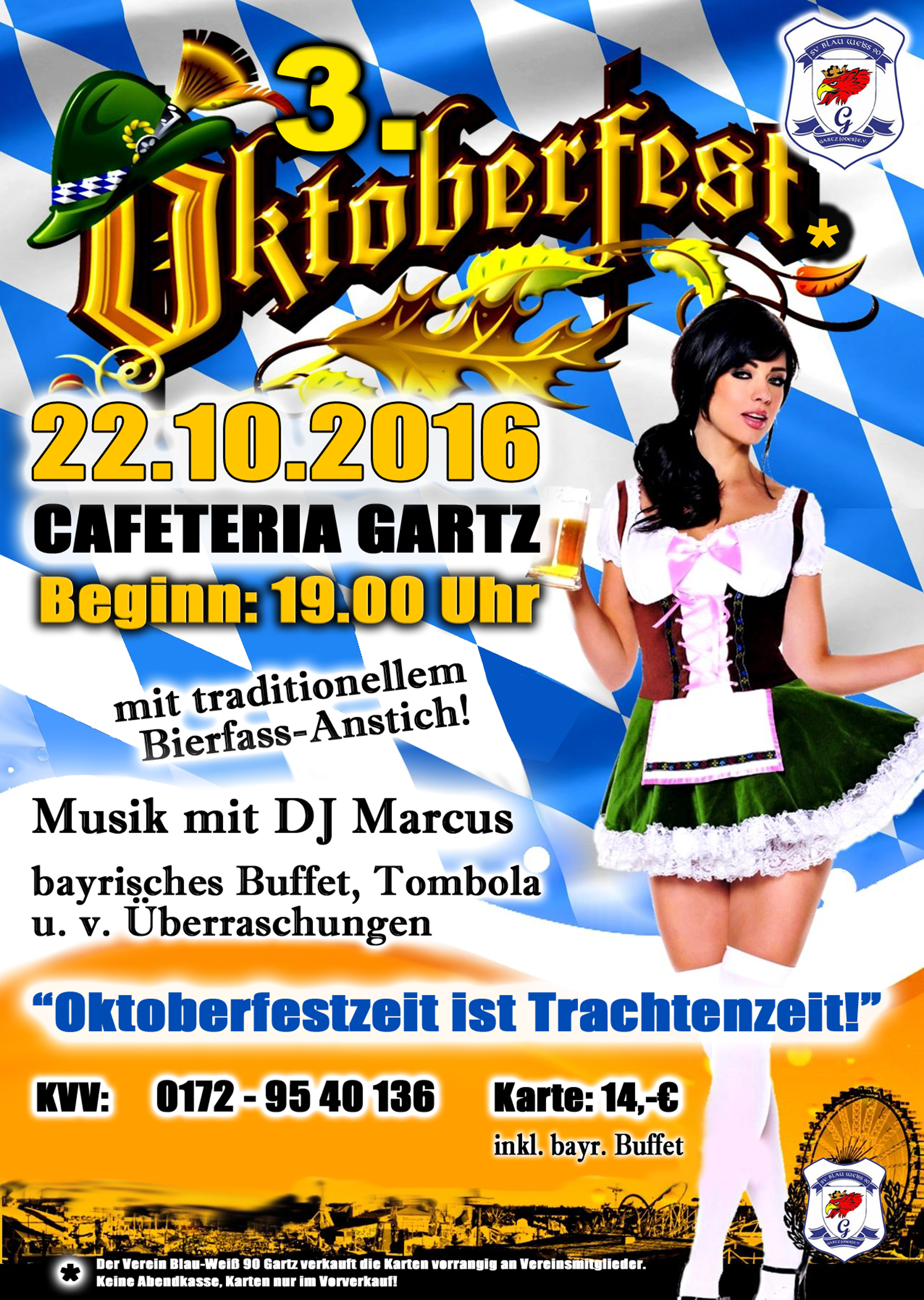 Joa mei, do schaut’s her… Gaudigarantie!!! 22. Oktober 2016 Samstag Am 22. Oktober 2016 startet zum dritten Mal das Oktoberfest in Gartz/Oder. Mit allen bekannten Wiesn Hits und brennendheißen Beats im Gepäck versorgt euch DJ Marcus. Vorheriger Eintrag Nächster Eintrag