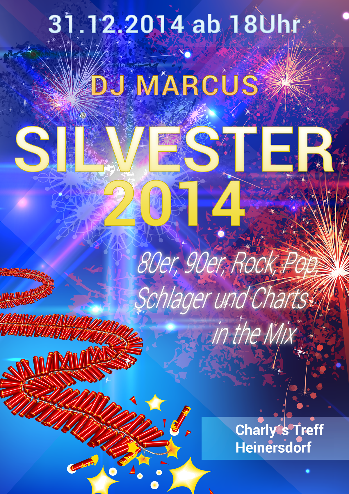 Silvester 2014 31. Dezember 2014 Mittwoch 18:00 Ausverkauft Charly´s Treff in Heinersdorf 31.12.2014 ab 18Uhr 80er, 90er, Rock, Pop, Schlager und Charts in the Mix by DJ Marcus Vorheriger Eintrag Nächster Eintrag